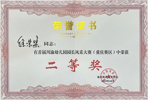 由重庆市教育委员会、四川省教育厅联合主办的“川渝携手 幼见未来”首届川渝幼儿园园长风采大赛已圆满落幕。这场赛事规格高、赛制严,汇聚了川渝两地众多深耕学前教领域的优秀园长,竞争格外激烈。大赛通过“案例撰写”“视频评审”“主题演讲与综合问答”等多个关键环节,全面考察园长的战略规划、管理实践、文化引领及综合应变能力。我园徐荣集园长,凭借个人专业素养与先进的教育理念,以及在各环节中展现出的从容与智慧,成功从众多参赛者中脱颖而出,最终荣获重庆赛区二等奖!